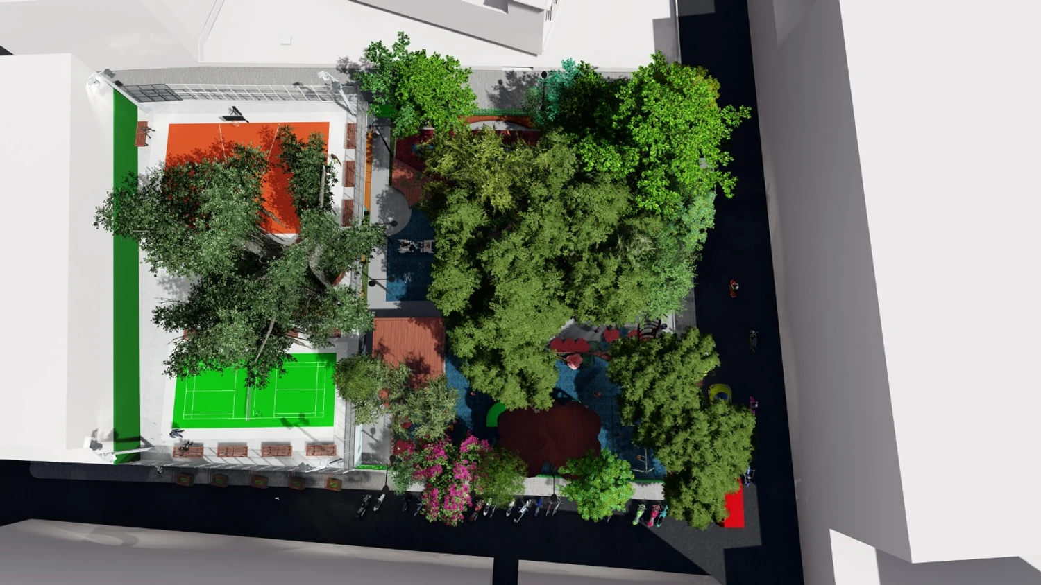 The park will also feature a special sports area, with a badminton court and a 3x3 basketball court. Below the sports area, there will be 102 designated motorbike parking and two commercial parking slots for cars.