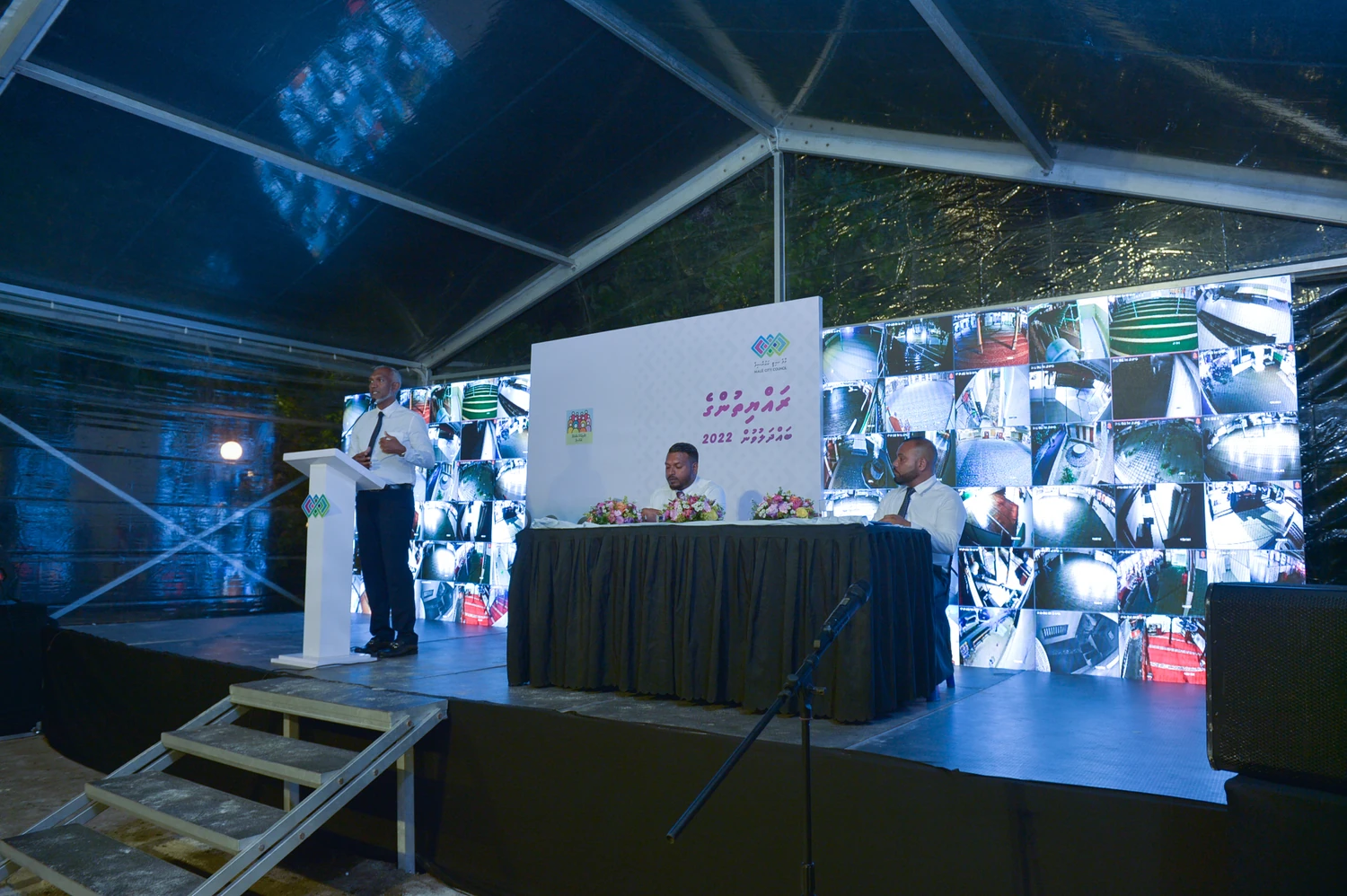 މާލެ ސިޓީ ކައުންސިލުން މިސްކިތްތަކާއި ޕާކްތައް ބެލެހެއްޓުމަށް ޤާއިމްކުރި މޮނިޓަރިންގް ނިޒާމް އިފްތިތާހްކޮށްދެއްވީ ރޭ ލޮނުޒިޔާރަތް ޕާކުގައި ބޭއްވި މާލެ ސިޓީގެ ރައްޔިތުންގެ ބައްދަލުވުމުގައި މާލެ ސިޓީގެ މޭޔަރު ޑރ. މުޙައްމަދު މުޢިއްޒުއެވެ.
